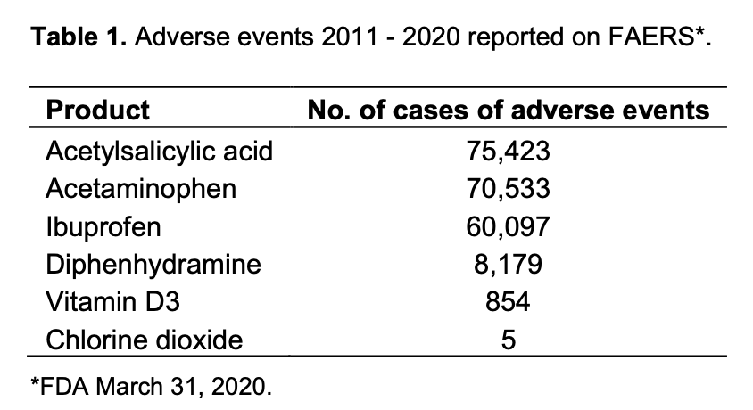 FDA likened chlorine dioxide to Clorox and warned consumers it was unsafe. Yet aspirin (acetylsalicylic acid) and other common substances prompted thousands more reports of “adverse events.”